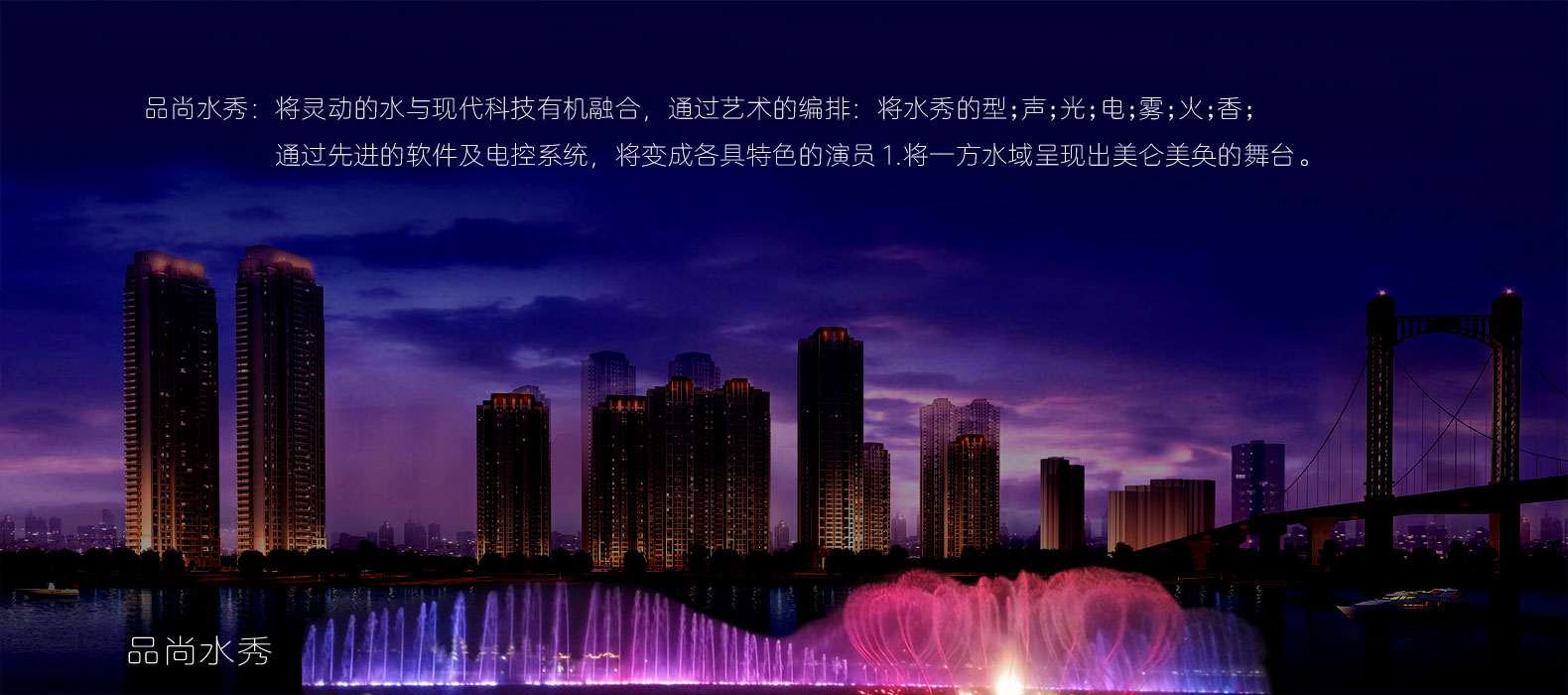品尚水秀 隸屬于寧波品尚景觀工程有限公司, 品尚水秀是一家享有國際聲譽的舞美聲光秀水景跨國企業;業務范圍涉及音樂噴泉,程控噴泉,廣場噴泉,城市景觀噴泉,湖內浮筒噴泉,小區噴泉,大型室內噴泉的工程設計施工,霧森系統,人造冷霧,高壓人造霧...